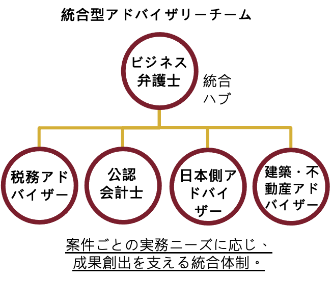 私たちの進め方 従来、多くの企業では、問題が顕在化した後に弁護士や会計士へ相談するという対応が一般的でした。しかし実務上は、問題発生後の対処ではなく、意思決定に先立ち、課題を整理し全体構造を設計することの方が、結果としてリスク低減およびコスト管理の観点から有効であるケースが少なくありません。 当社は、問題解決にとどまらず、 事前段階から関与し、全体を統合的に設計・推進するアプローチを採用しています。 この統合型サービスにより、クライアントは複数の専門家を個別に調整する必要がなくなり、案件全体を一つの意思決定構造のもとで進めることが可能となります。 意思決定支援における本質的課題 法務、税務、事業、クロスボーダー要素が複合的に関係する案件において、最終的な成果を左右するのは個々の専門性そのものではなく、専門領域間の整理不足による意思決定の分断や遅延です。 実務では、各専門家がそれぞれの領域において適切な見解を提示していたとしても、それらが整理されない限り、意思決定として十分に機能しない状況が生じます。」。当社は、この分断を解消し、意思決定者が全体像を踏まえた判断が可能な状態を構築する役割を担っています。 当社の役割 当社は、従来型の専門的助言に加え、 意思決定プロセスの上流段階から関与し、以下を支援します:本質的に意思決定すべき課題の特定分散した専門的見解の構造化および整理リスク・時間・コストを踏まえた選択肢提示と、意思決定形成から実行推進までの支援ここで重要なのは、統合そのものを目的とするのではなく、 現実条件下において実行可能な意思決定を導く点にあります。 推進プロセス 当社は、案件の性質に応じて柔軟に対応しつつ、一般的に以下のプロセスに沿って支援を行います:まず、課題の本質および背景を整理し、構造化する ・その上で、関連論点を抽出・精査する分散した専門的視点を整理し、比較可能な選択肢として提示する各選択肢における実務上の制約やリスクを明確化する意思決定形成後は、関係者間の調整を図りつつ、実行を推進するここで重視されるのは、単なる理論的整合性ではなく、実務として成立し得るか、実行可能かという観点です。 統合によるリスク低減とコスト管理 案件の複雑性は、必ずしも課題そのものの難易度だけに起因するものではなく、以下のような構造的要因によって増幅されることが多く見られます:専門領域ごとの分断および横断的連携の不足意思決定における役割および責任の不明確さクライアント自身が統合の主体とならざるを得ない状況明確な意思決定構造と役割分担を設計することで、各専門性が適切な位置で機能する状態を構築し、重複や衝突による非効率を排除します。 その結果として、リスクの顕在化を抑制し、 コストおよび時間の両面における最適化につなげます。 統合型サービスの価値が高まる場面 クロスボーダー案件(特に台日間の進出・提携・M&A・投資)複数専門領域が同時に関与する案件企業承継、資本構造設計、長期戦略を伴う案件不動産、建築、事業投資が複合的に関係するプロジェクト 案件開始時の進め方 多くの案件は、初期段階における課題整理および方向性の検討から開始します。 この段階の目的は、即座に結論を導くことではなく、意思決定の方向性が適切であるかを確認することにあります。 適切な方向設定がなされることで、その後の検討および実行の効率が大きく向上します。 なぜ私たちのサービスは価値を創出できるのか ワンストップによる統合支援 典型的な法務・税務・クロスボーダービジネス案件においては、リスクの多くは専門領域そのものではなく、専門間の分断や連携不足から生じることが少なくありません。当社は、統合的な視点のもとで各専門領域の相互関係を整理し、クライアントが全体像を把握した上で判断できる環境を構築します。 その結果、専門領域の交差部分における判断の盲点を回避し、意思決定の精度向上につなげます。 クロスボーダーネットワークの実務活用 当社は、台日を中心とした産業・金融・行政分野におけるネットワークを長年にわたり構築してきました。これらは単なる人脈や情報にとどまるものではなく、案件の進行段階に応じて、適切な専門家、資源、パートナーを接続することで、案件の実行可能性を高める基盤として機能します。 付加価値の創出とリスクの早期排除 統合型のアプローチにより、クライアントは窓口を一本化でき、複数の専門家との個別調整に伴うコミュニケーションコストを低減できます。 また、試行錯誤による無駄なコストや、意思決定の遅延に伴うリスクを抑制することが可能となります。当社が重視するのは、目の前の課題への対処にとどまらず、将来的な重大リスクや意思決定の誤りを未然に防ぐことにあります。 多様な専門性を有するグローバルチーム 当社のチームは、法務・財務・税務・経営・建築