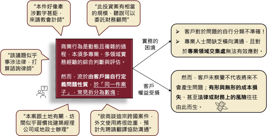 我們能幫助您解決什麼 為什麼許多商務案件會窒礙難行? 在企業經營、投資、跨國合作或組織調整的過程中,真正的挑戰往往不是「缺乏專業意見」,而是問題本身橫跨多個專業領域,卻缺乏一個整合的決策視角。 當商業目的、法律、財稅、與實務運作交雜牽引,「單點諮詢」對於問題解決往往顯得力有未逮。 實務常見的判斷盲點與困境 企業在面對各類日常或關鍵案件時,往往會分別尋求不同領域專業的協助。然而在實務運作中,常出現以下情形:各專業皆提出「在其領域內正確」的建議建議之間卻缺乏整體性的整合、優先順序與取捨判斷最終,決策者需自行拼湊資訊,承擔跨領域整合與決策風險問題的關鍵,往往不在於單一專業能力的不足,而在於多數商業與法律議題,本質上即具跨領域特性,難以由單一專業獨立完成全面判斷。 以下情境,為常見的複合式議題(包括但不限於): 經營權安排 × 資產傳承 × 稅務效率:從股權設計、信託與遞延課稅,到成本控管的整體規劃 → 涉及公司治理架構、稅務規劃與資產配置等跨領域整合判斷。組織調整 × 策略合作 × 商業模式轉換:從組織優化、策略聯盟,到代理權取得的結構性規劃 → 涉及法律架構設計、財稅評估與商業策略之通盤分析。投資或併購前之結構與治理設計:從支撐決策的事前盤點,到提升案件可推進性的整體安排 → 涉及法遵架構、財稅規劃、公司治理與跨專業協作整合。跨國合作之落差與整合推進:從商機發掘與關係建立,到弭平制度與決策認知差異的專案管理 → 涉及跨境法律、稅務制度、商務文化與決策邏輯之整合協調。新事業投資 × 合作架構 × 利益分配機制:從合作模式、出資比例,到權責分工與退場機制規劃 → 涉及契約設計、公司治理、財務安排與商業誘因之綜合考量。關係企業架構 × 風險隔離 × 營運效率:從控股結構、企業分工,到責任風險與資金流之安排 → 涉及公司法架構、稅務影響、風險控管與經營管理之整合判斷。 多數商業決策的關鍵,在於釐清目的與問題本質,並進行整體判斷與整合規劃;而非僅從單一專業的技術面切入 當問題需要被「整體理解」時: 企業除了需要專業意見,更需要能夠協助梳理問題、釐清選項的決策支援團隊。 我們如何在這類案件中實際參與及運作?詳見「我們如何運作」頁面 我們如何運作 協力的「整合型服務」、「跨專業一站式服務」。 法律+財稅+經營管理知識+商業運作+人際網絡+精準外文的六合一支援 「整合型服務」的價值 「當單一專業無法完整處理問題時,誰能為客戶梳理結構、有條理地規劃策略,並精準推動落地?」整合型服務,不僅是多元專業的結合,更在於提供跨領域的整體判斷與執行能力,為客戶帶來五大價值: 協力顧問股份有限公司 協力國際商務法律事務所 結合「整合視角」與「專業深度」,協助企業有效控管風險、提升決策品質,提供一站式商務整合服務。 首頁我們能幫助您解決什麼服務與專長我們如何運作實績與案例 聯 絡 資 訊 市內電話+886 (02) 2528-2830 電子郵件 union989@ms16.hinet.net 地址:臺北市信義區永吉路302號6樓之2 公司同仁之「專題式推廣平台」 專題式推廣平台 (YouTube)